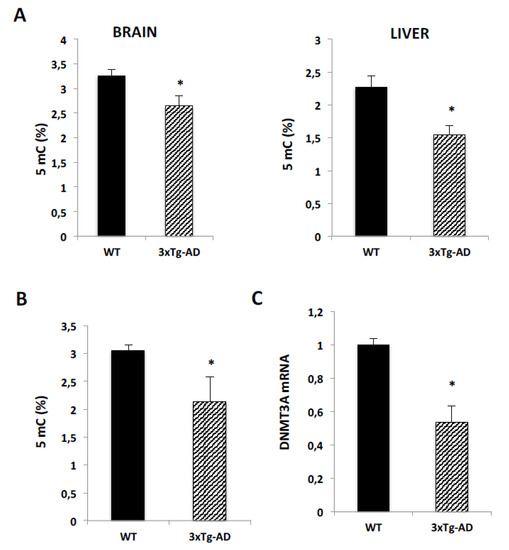 In the light of the finding that 5mC levels were reduced in human DNA from AD patients, we wondered if global methylation was also regulated in a transgenic mice AD model. We used a triple transgenic mice model (APP/BIN1/COPS5), which shows Aβ deposits and severe deficits in synaptic plasticity [23]. We observed a significantly decrease in 5mC levels, either in the brain and liver of 3xTg-AD mice (Figure 5A) in comparison to values obtained in DNA samples from wild type mice. In brain samples, the medium value of global DNA methylation in wild type mice was 3.26% ± 0.12 and this value decreased to 2.65% ± 0.2 in 3xTg-AD mice. In liver samples, 5mC values were 2.27% ± 0.17 in wild type mice and 1.55 ± 0.14 in transgenic mice. We also analyzed 5mC levels in serum samples from these mice. Global methylation levels were also significantly reduced from 3.05% ± 0.1 in wild type to 2.14% ± 0.44 in 3xTg-AD mice (Figure 5B). As we observed a decrease in DNMT3a expression in human blood samples of patients with Dementia, we also analyzed the expression of this gene in 3xTg-AD mice brain. Consistent with our previous results, we observed a significant reduction of over 40% in DNMT3a expression in the brain of 3xTg-AD mice (Figure 5C).
