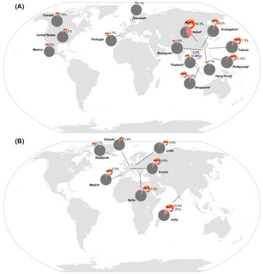 Prevalence of shellfish allergy. The estimated rate of shellfish allergy (pink) in populations at different geographical areas based on (A) self-reports and (B) IgE sensitization. Percentage in purple indicates the prevalence of shellfish allergy based on oral food challenge results. Asterisk (*) indicates that only children and/or adolescent populations aged 18 years or below were included in the estimation of shellfish allergy prevalence.
