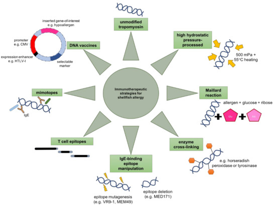 Immunotherapeutic strategies for overcoming shellfish allergy. The applicability of unmodified tropomyosin as a sublingual immunotherapy (SLIT), hypoallergens constructed by high hydrostatic pressure processing, Maillard reaction, enzyme cross-linking and epitope manipulation, immunoregulatory peptides including T cell epitopes and mimotopes, as well as hypoallergen-encoding DNA vaccines has been investigated over the past years.
