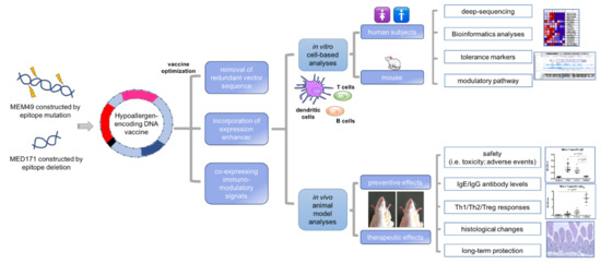 Experimental design of the hypoallergen-encoding DNA vaccine study. Two hypoallergens, MEM49 and MED171, of shrimp tropomyosin were constructed by epitope mutation and deletion, respectively. DNA vaccines were then constructed by cloning and expressing the hypoallergens in mammalian expression plasmids. Our data demonstrated that pMEM49 and pMED171 were effective in down-modulating shrimp tropomyosin-induced allergy in BALB/c mice, such as suppressing the Met e 1-specific IgE and inflammatory responses in the gut while increasing specific IgG2a with inhibitory functions. Optimization of the vaccines would follow in constructing next-generation DNA vaccines with enhanced in vivo expression of the hypoallergen and immunogenicity of the vaccines. In vitro cell-based analyses involving the major immune players (e.g., dendritic cells, T and B cells) in human and mouse to dissect the modulatory mechanism of the hypoallergen-encoding DNA vaccines, as well as in vivo analyses in murine model for the safety and therapeutic efficacies of the vaccines are essential in addressing the applicability of the vaccines for the clinical treatment of shellfish allergy.