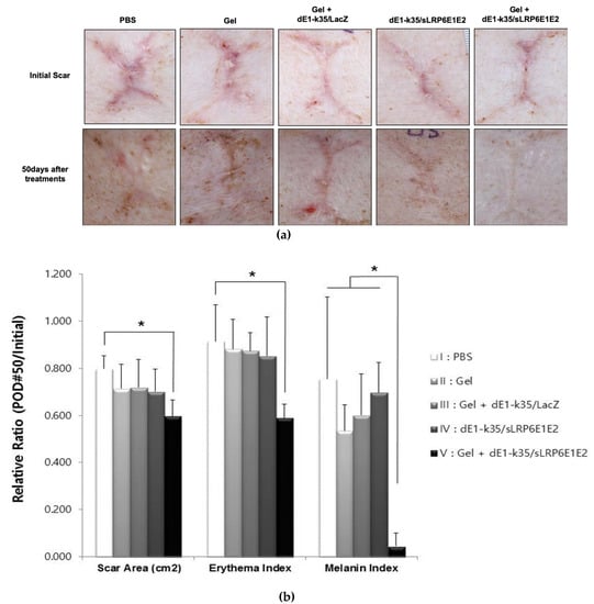 The therapeutic effect of sLRP6E1E2-expressing Ad on scar tissue was evaluated with scar size and erythema and melanin indices. The values listed below correspond to the following treatment groups: I, PBS (control); II, alginate gel (gel); III, alginate gel encapsulating dE1-k35/LacZ (gel+dE1-k35/LacZ; capsulated control); IV, naked dE1-k35/sLRP6E1E2 (naked LRP6); and V, alginate gel encapsulating naked dE1-k35/sLRP6E1E2 (gel+dE1-k35/sLRP6E1E2, capsulated LRP6). Photographs of scars were taken before and after each treatment, and the scar area was measured with Image J software (Figure 2a). The sizes of initial scars were measured as 1.46 ± 0.88, 1.51 ± 0.79, 1.21 ± 0.15, 1.15 ± 0.18, and 1.42 ± 0.3 cm2 in each group, respectively, and there were no statistical differences. However, the sizes of the scars decreased to 79.8%, 71.3%, 71.9%, 70.1%, and 59.6% of initial scar, respectively, by the 50th day after treatments. This indicates that sLRP6E1E2 expression from Ad effectively reduced the size of the scar in Groups IV and V. Furthermore, in only Group V, gel encapsulating dE1-k35/sLRP6E1E2-treated scars showed a statistically significant reduction in scar area (p < 0.05; Figure 2b, left).