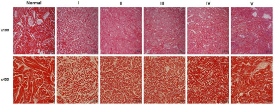 Tissues were stained with picrosirius red, which specifically binds collagen fibrils of various diameters. On the 50th day after treatment, scar tissues in Groups IV and V had closely packed collagen fibers and formed complete bundles compared to Groups I to III, which is similar to normal dermal structure (Figure 3). These data suggested that sLRP6E1E2 induces collagen rearrangement to resemble that of mature, bundle-shaped collagen fibers, and gel encapsulation may enhance its efficacy.