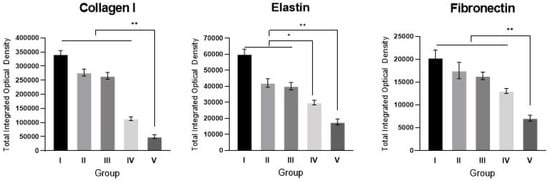 Representative sections of tissues from the center areas of the scar at 50th day after treatment were stained, and expression levels of type I collagen, elastin, and fibronectin were semi-quantitatively analyzed with MetaMorph®. Values are calculated as the means of the optical density of six different digital images. The expression levels of type I collagen, elastin, and fibronectin were significantly reduced in the alginate gel encapsulating dE1-k35/sLRP6E1E2-treated group (Group V) compared with other groups. Reduction in type I collagen was significant in Group IV compared to Groups I to III, but significantly higher (220%) than that of Group V (* p < 0.05, ** p < 0.01).