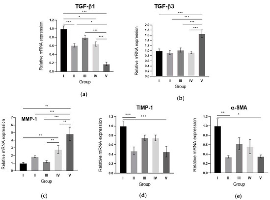 Scar remodeling-associated molecules such as MMP-1, TIMP-1, and α-SMA are important markers of the effects of TGF-β on wound repair. We performed a qRT–PCR analysis of MMP-1, TIMP-1, and α-SMA and showed differential expression of these matrix remodeling-associated molecules among experimental groups. MMP-1 expression levels of Group V scar tissues were significantly increased by 4.9- and 1.7-fold, respectively, versus those of Groups I and IV scar tissues (p < 0.001, Figure 5c). In contrast, TIMP-1 and α-SMA expression levels of Group V scar tissues were significantly decreased by 2.2- and 2.8-fold, respectively, compared to Groups I and II (p < 0.01, Figure 5d,e). However, there was no significant difference between Groups IV and V. These results suggest that sLRP6E1E2 upregulates MMP-1 and downregulates TIMP-1 and α-SMA, which are major players in collagen breakdown.
