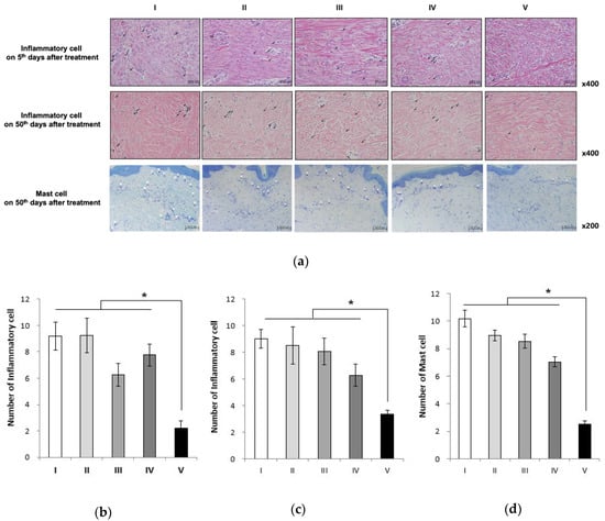 Inflammatory cell and mast cell count in pig scar tissue. (a) Inflammatory cell (black arrow) infiltration, as demonstrated by H&E staining (magnification, 400×) and mast cell (white arrowhead) count with toluidine blue staining in the scar area. The numbers of inflammatory cells on day 5 (b) and day 50 (c) were significantly lower in the alginate gel encapsulating dE1-k35/sLRP6E1E2-treated scar tissues (Group V; * p < 0.05). (d) The numbers of mast cells on day 50 were significantly lower in the alginate gel encapsulating dE1-k35/sLRP6E1E2-treated scar tissues (Group V) compared with other groups (* p < 0.05).