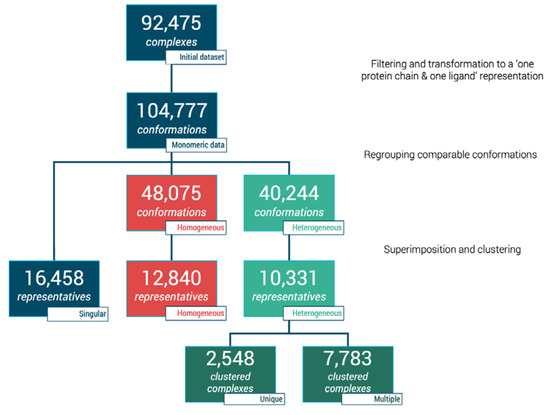 Moreover, 12,840 groups were considered as homogeneous in our dataset, equivalent to 48,075 units (45.9% of our monomeric dataset, see Figure 1). As those complexes display identical binding modes, a 3.75-fold reduction can be processed when considering only one representative per group, i.e., 12,840 unique representatives.