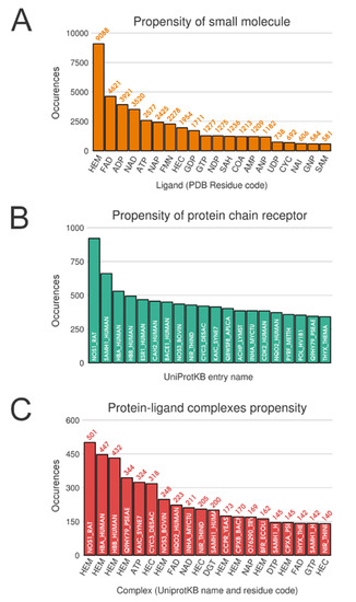 Unsurprisingly, from the multimeric complex dataset, the most represented ligand in the PDB is the heme (PDB residue code Protoporphyrin IX Containing FE (HEM)) with 9088 occurrences, accounting for a representation of 7.9%. Expected popular ligands are present among the 10 most frequent molecules in the PDB, such as nucleobase derivatives, e.g., Adenosine-5’-Triphosphate (ATP), Nicotinamide-Adenine-Dinucleotide (NAD), Flavin Mononucleotide (FMN), S-Adenosyl-L-Homocysteine (SAH) (see Figure 2A). Interestingly, using SMILES identity, a large number of 17,135 unique small molecules are found. Consequently, this unbalanced ligand distribution is reflected among our protein representation where nucleotide coenzymes receptors and heme receptors are also frequently observed (Figure 2B). The strong occurrences of these specific ligands and receptors culminate logically in a large presence of their corresponding complexes. Heme bound to nitric oxide synthase, with respectively 9,088 and 921 occurrences, are represented by 501 distinct conformations (see Figure 2C).