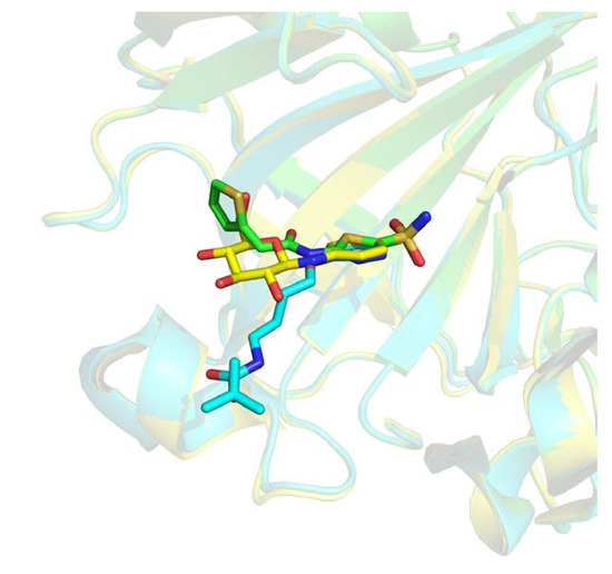 Three-dimensional (3D) representation of three different ligands bound to Carbonic Anhydrase 2 receptor (Protein Data Bank (PDB) IDs 4iwz in green, 2rfc in blue, 2hl4 in yellow).