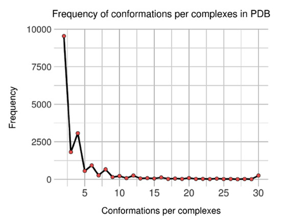 At first, an initial number of 18,478 groups (of complexes) were generated containing between 2 and 501 conformations. As each group features at least two units, distribution of conformations count per complex was analyzed (see Figure 4). It shows an unbalanced representation, where complexes with few conformations are predominant: the 9542 of groups (51.6%) featuring two conformations represent 21.6% of the 88,319 conformations. Still, complexes with more than 30 conformations tally for 17.8% conformations and only 1.4% of the groups; the biggest group is again for brain nitric oxide synthase, with 501 occurrences.