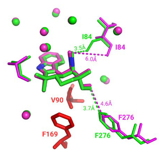 Three-dimensional representation of WelO5 protein in complex with 6CU ligand stick representation (PDB IDs 5iqv green and 5iqu magenta). Residues in PDB entry 5iqu that are unresolved in PDB entry 5iqv are colored in red. Closest distances observed are shown in dashes. Superposed residues are displayed in spherical representation.