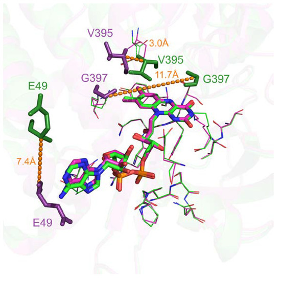 Only 615 comparisons out of 233,417 (0.26%) have a pocket RMSD greater than 1.0 Å. These specific cases are largely caused by flexible secondary structure, such as loop highlighted in Figure 6. Visual inspection of flavin adenine dinucleotide receptor with Flavin-Adenine Dinucleotide (FAD) ligands shows a significant number of binding residues that are conserved. However, residues such as G397 belong to a flexible loop leading to a 11.7 Å distance between the two Cαs after alignment (highlighted by orange dashes on Figure 6). E49 and V395 also displayed significant differences with 7.4 Å and 3.0 Å shifting. Interestingly, these deviations can highlight either potential multiple binding roles due to their proximity with the ligand in either cases or space filling characteristics.