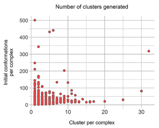Figure 7 underlines the number of representative units generated from clustering relative to the number of initial conformations available. Interestingly, despite having initially 22 complexes with more than 100 initial distinct conformations, none leads to more than 35 conformations, and only four have more than 20 distinct conformations.