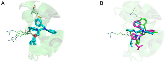 Three-dimensional representation of Cardiac Troponin with Bepridil (PDB ID 1lxf), ligand represented in ‘stick’ representation, binding residues in ‘lines’ representation: (A) Cluster of three identical ligand conformations (average weighted fragment root mean square deviation (wRMSDf) 0.67 Å), (B) three distinct conformations extracted from same NMR structural model (average wRMSDf 2.90 Å).