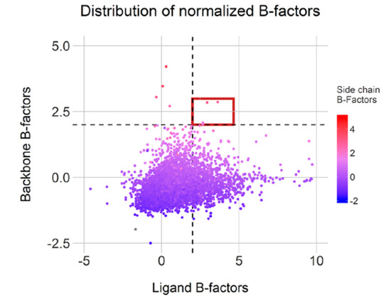Moreover, 1199 conformations displayed a ligand normalized B-factor value above 2.0Å2, an arbitrary threshold but described as clearly flexible by Bornot et al. [22]. The average normalized B-factor values calculated on both backbone and side-chain residues indicate mostly rigid or intermediate environment for these ligands. Surprisingly, only four cases (highlighted in red in Figure 9) display both mobile ligand and binding sites and only 77 cases featured flexible side-chains (above 2.0 Å2). This observation illustrates an overall binding site rigidity in opposition to ligand flexibility. Overall, 1211 conformations from our initial 7642 representatives can be categorized as cautionary due to high flexibility in either the ligand or protein counterpart. Of course, the positioning of some of these ligands could be attributed to low resolutions or poor fitting of the ligands in the electron density map.