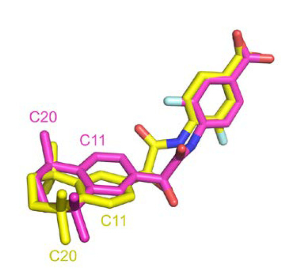 Atom label inverted in two PDB entries (PDB IDs 4lbd in magenta and 1exx in yellow).