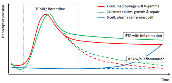 Figure 1. Hypothesized sequential modifications in the transcriptome for different gene sets and its correlation with histological changes. TCMR, T-cell mediated rejection; IFTA, interstitial fibrosis and tubular atrophy. Continuous lines depict transcriptome expression leading to IFTA with inflammation while dotted lines depict transcriptome expression leading to IFTA without inflammation.