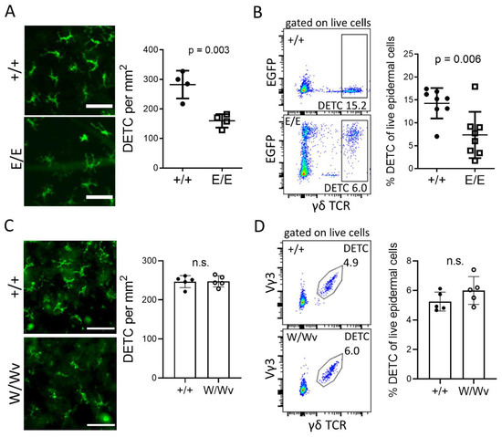 Mice were sacrificed and ear skin sheets prepared. Skin was placed dermal sides down in 20 mM EDTA in 1X phosphate-buffered saline (PBS) for 3.5 h at 37 °C. Subsequently, the epidermis was peeled off and placed on a glass slide for staining. Unspecific binding sites were blocked with 10% fetal calf serum (FCS, PAN-Biotech, Aidenbach, Germany) in PBS for 1 h at room temperature. DETC were stained with anti-Vγ3-TCR-FITC (clone 536; #553229 BD Biosciences, San Jose, CA, USA) diluted to 2.5 µg/mL in 1% FCS/PBS overnight at 4 °C. Nuclei were stained with 1 µg/mL DAPI (ROTH, Karlsruhe, Germany) in 1% FCS/PBS followed by three washing-steps with 1% FCS/PBS. Finally, the slides were mounted with Fluoromount-G (eBioscience, San Diego, CA, USA) and examined with a Leica DM2500 microscope (Leica, Wetzlar, Germany). Four to five random pictures at 100× magnification from each of 4 ear sheets per mouse were evaluated to determine the number of DETC per mm2. DETC were counted manually with the plugin “Cell Counter” in the Image J Software. Representative images were cropped from larger images and adjusted for brightness and contrast to improve clarity.