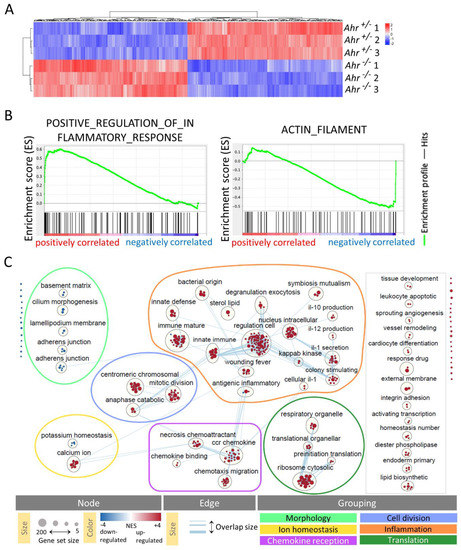 We used gene-set enrichment analysis (GSEA; http://software.broadinstitute.org) to determine the gene ontology (GO) pathways that were positively or negatively correlated to the Ahr -/- genotype. For example, genes of the positively associated pathway “positive regulation of inflammatory response” were to a large part up-regulated and genes of the negatively associated pathway “actin filament” tended to be down-regulated in Ahr -/- DETC (Figure 2B). In total, GSEA revealed 144 pathways, which positively correlated with the Ahr -/- -genotype at p-values of p < 0.01 and FDR-adjusted p-values (q-values) of q < 0.05 and 34 pathways, which negatively correlated at p-values p < 0.01 and q-values q < 0.6. Using the EnrichmentMap-App in Cytoscape these pathways were clustered by the Cytoscape-App AutoAnnotate (Figure 2C) according to the protocol of Reimand et al. [30]. By further manual comparison of the biological processes behind the pathways and the overlaps between the different clusters we identified six cluster-groups and named them according to their most obvious function. We tagged “inflammation,” “chemokine reception,” “translation,” “cell division” from the positively correlated pathway-clusters. The group “ion homeostasis” contained positively and negatively-associated pathway-clusters and the rest of negative-associated pathway-clusters could be combined in the group “morphology”’ (Figure 2C). With 1767 pathways the cluster-group “inflammation” contained the majority of AHR-dependently regulated pathways, indicating a leading role of AHR-signaling in the transcription profile for this function. Note that in the absence of AHR the genes in these pathways were in most cases up-regulated, suggesting that AHR dampens their expression in wild-type DETC.