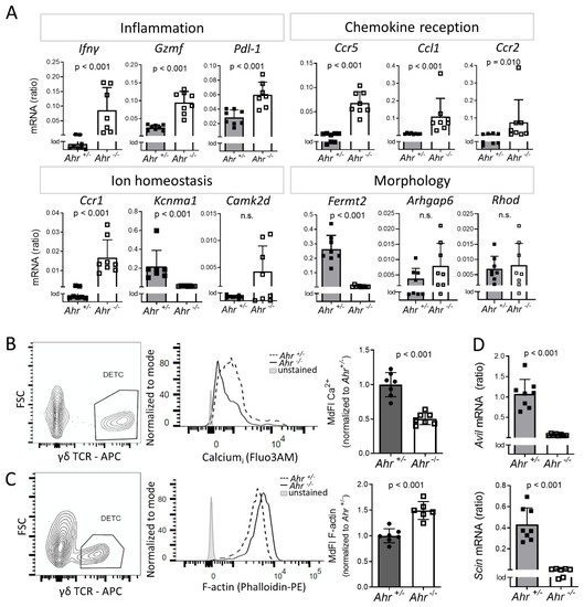 Verification of gene-expression and effects of Ahr-deletion in DETC on calcium and F-actin. (A,D) RNA of DETC, FACS-sorted from 2 weeks old mice was isolated. Expression of indicated genes was measured by qPCR; shown are ratios to the housekeeper gene Rps6 (n = 8 mice; t-test for Gzmf, Pdl1, Ccr5, Rhod, Avil, Scin; Mann–Whitney-test for remaining genes). (B) epidermal cells were isolated from 4–8 weeks old mice, stained with Fluo3AM and antibodies against γδTCR and analyzed by flow cytometry; shown are the median fluorescent intensities of Fluo3AM (MdFI) normalized to Ahr +/- mice. Dead cells were excluded by DAPI-staining (3 experiments, n = 7 mice). (C) epidermal cells were isolated from 8–11 weeks old mice, stained with phalloidin-PE and antibodies against γδTCR and analyzed by flow cytometry; shown are the median fluorescent intensities of phalloidin (MdFI) normalized to Ahr +/- mice (2 experiments, n = 6–7 mice (B,C) statistical test: Mann–Whitney-test.