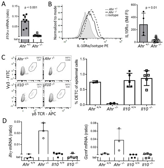 The inflammatory activity of T cells is regulated by several mechanisms including signals from inhibitory auto- or paracrine acting cytokines. We hypothesized that the down-regulation of receptors for such cytokines might have led to the increased inflammatory signature in DETCs of Ahr -/- mice. One potent regulator of T cell activity is IL-10, which binds to IL-10-receptor (IL-10R) [48]. The microarray results revealed that Il10rα expression was decreased in DETC of Ahr -/- mice (fold change −2.27, adj. p-value < 0.001, Figure 4A). IL-10Rα-protein on the surface of Ahr -/- DETC was significantly and strongly reduced by approximately 90% (Figure 4B). Il10rβ was not affected (GEO accession: GSE142437). Human IL-10 inhibits the secretion of IFNγ by αβ and γδ T cells [49]. The impact of IL-10 on murine DETC is unknown. Therefore, we addressed the question of whether the loss of IL-10 signaling through the IL-10R might push the DETC into an inflammatory condition and prevent them from proliferation and forming dendrites. To answer this, we analyzed DETC from Il-10 -/- mice. DETC from Il-10 -/- mice were normal in number—we found a cell density of 318 DETC/mm2 (SD 13.7; n = 3 mice) or about 1% of epidermal cells (Figure 4C), and the cell morphology was normal (Supplementary Figure S1B). Furthermore, we could merely detect expression of the inflammatory cytokines Ifnγ or Gzmf (Figure 4D). Therefore, these data indicate that lack of IL-10 signaling does not impact the establishment and inflammatory condition of DETC in a non-inflammatory situation.