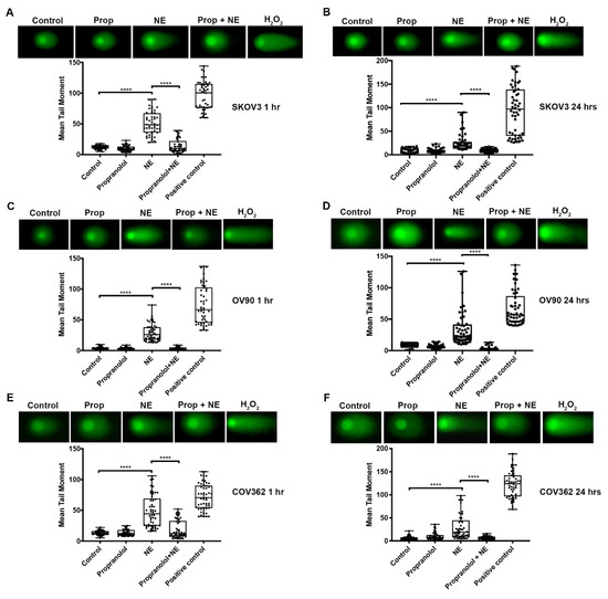 NE does not induce DNA single strand breaks in ovarian cancer cells. Alkaline comet assay after exposure NE (10 µM) in SKOV3 (A) and COV362 (B) cells after 1 h or 24 h. Alkaline comet assay after propranolol pre-treatment followed by NE exposure for 1 h or 24 h in SKOV3 (C,D) and COV362 cells (E,F). Single-strand breaks were measured using the percentage of DNA in tail. Fifty (50) comets were evaluated for each treatment. Data presented is representative of three independent experiments performed in duplicate. Statistical analysis was performed using one-way ANOVA with Dunn’s multiple comparison correction. No significant differences were observed among treatments (p > 0.05).