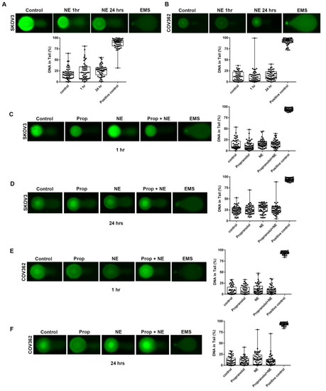 To assess SSB, SKOV3, and COV362, cells were exposed to NE at the timepoints required for each experiment: 1 h or 24 h. After NE exposure, the cells were collected and processed to perform the alkaline version of the CometAssay® as described by the manufacturer (Trevigen, Gaithersburg, MD, USA). The nuclei were stained with Yoyo-1® and visualized using the EVOS™ M7000 Imaging System (Thermo Scientific, Rockford, IL, USA). Fifty nuclei were randomly selected and analyzed for percentage of DNA in tail using the Comet Analysis Software (Trevigen, Gaithersburg, MD, USA). Ethyl methanesulfonate (EMS) (Sigma, St. Louis, MO, USA) was used as a positive control at a concentration of 12 mM for 4 h.