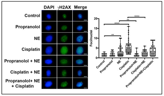 Cells were plated in 4-well chamber slides (25,000 cells/well) and left to set overnight. The next day, cells were either left untreated (control) or treated once with of EPI (10 µM) or NE (10 µM). After time-point completion (1 h or 24 h), positive control cells were exposed to 30% H2O2 for 3 to 4 min, and then all samples were fixed with 4% formaldehyde for 10 min at 4 ºC. Cells were permeabilized with 5% PBS Triton X-100 for 10 min at room temperature, washed with cold PBS, and then blocked with 2% BSA in PBS at room temperature for 1 h. After blocking, cells were incubated with γ-H2AX (#2577, 1:400, Cell Signaling Technology, Denver MA, USA) overnight in a shaker at 4 ºC. After primary antibody incubation, cells were washed with cold PBS and incubated with AlexaFluor 488 (A11034, Invitrogen, Grand Island, NY, USA) at 1:600 dilution in PBS/2% BSA for 1 h at room temperature. Cells were washed several times with cold PBS and stained with 4′,6-diamidino-2-phenylindole (DAPI) (R37606, Invitrogen, Grand Island, NY, USA) for 5 min and mounted with Prolong Gold medium (P36934, Invitrogen, Grand Island, NY, USA). The same protocol was followed for the experiments with propranolol and the combination treatments of cisplatin and NE. For all experiments, slides were imaged using an Eclipse Ts2r inverted microscope (Nikon Instruments, Mellvile, NY, USA) at 20× magnification. Fifty random cells were analyzed per condition by maxima quantitation using Image J software following the protocol described in the Duke University microscopy protocol guide [62].