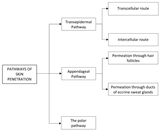 A molecule can penetrate into the skin through different pathways (Scheme 1) including the transepidermal route (diffusing across the epidermis), the appendageal pathway (through hair follicles or sweat ducts) or polar pathway (through polar microchannels) as illustrated in Figure 1 [42].