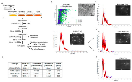 Adipocytes secrete extracellular vesicles whose size and concentration varies with metabolic insults. Schematic representation of vesicle isolation protocol by differential centrifugation and further analysis from secretomes obtained from control C3H10T1/2 adipocytes and after metabolic insults with palmitate (500 µM, 18 h), oleic acid (1 mM, 24 h) and high glucose (4.5 g/L)/high insulin (5 µg/mL, 24 h) treatment (HGHI) (A). Nanoshight analysis of isolated vesicles showing size distribution (nm) and particle dispersion (B–E); a representative TEM image of vesicles isolated from differentiated adipocytes is also shown (B). Mean size (nm) and estimated concentration is shown as particles/frame, particles/mL of secretome, and protein concentration (µg/µL) obtained after centrifuging secretomes from 18 cell plates of 35 mm (F). NTA: nanoparticle tracking analysis; TEM: transmission electron microscope; WB: western blot.