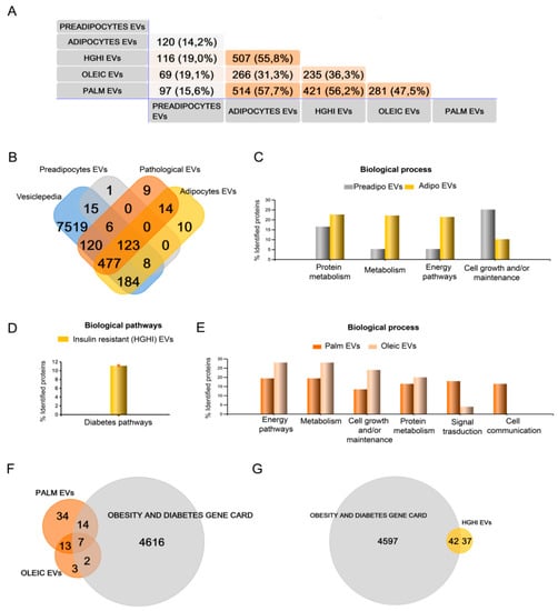 Qualitative (DDA) mass spectrometry analysis shows that extracellular vesicles (EVs) protein cargo varies with lipid hypertrophy and insulin resistance. EVs isolated from non-differentiated and differentiated adipocytes as control, and also from those treated with palmitate (500 µM, 18 h), oleic acid (1 mM, 48 h), and high glucose (4.5 g/L)/high insulin (5 µg/mL, 48 h) treatment (HGHI) were analyzed by mass spectrometry. A descriptive Venn diagram showing the overall number of proteins identified with an FDR <1% (99% protein confidence) in vesicles isolated from preadipocytes, control differentiated adipocytes, and those from the three pathological cell models (HGHI, palmitate and oleic acid hypertrophy) (n = 4 independent experiments considering only those proteins present in 3 out 4 samples) (A). All identified proteins were also compared to the Vesiclepedia database (B). Funrich functional analysis classification of identified proteins by biological process and pathways is shown (percentages per annotated genes in each class; number of genes in background) for vesicles isolated of pre- and mature adipocytes (C); of HGHI (D), and of palmitate and oleic acid treated cells (E). Venn diagrams comparing the Obesity and Diabetes Gene card database to those proteins exclusively identified (not present in EVs shed by control differentiated cells) in EVs from lipid hypertrophied (F) and HGHI (G) treated adipocytes.