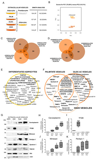 Quantitative Sequential Window Acquisition of All Theoretical Mass Spectra (SWATH) analysis of EVs shed by lipid hypertrophied and insulin resistant adipocytes identifies obesity-related proteins and potential biomarkers. Differences on protein cargo of adipocytes vs. preadipocytes, and also in those vesicles shed by palmitate, oleic, and HGHI treated cells compared to control adipocytes by comparative analysis of EVs by Sequential Window Acquisition of all theoretical fragment-ion spectra is indicated (A). Principal component analysis (PCA) analysis of transformed SWATH areas for the quantitative comparison of all samples (n = 4 independent experiments; n = 3 technical replicates for each independent experiment) (B). Venn diagrams comparing those proteins upregulated (C) and downregulated (D) in EVs from the three pathologic cell models is shown. A representative proteome map of EVs secreted from control adipocytes compared to non-differentiated cells is represented showing representative upregulated proteins in bold (E). A proteome map highlighting selected proteins up (bold) and down (italic) regulated in EVs isolated from lipid hypertrophied (palmitate/oleic acid) and insulin resistant (HGHI) adipocytes (F). Representative images of immunoblots and band quantification in box plot graphs for cereluplasmin, transforming growth factor-beta-induced protein ig-h3 (TFGBI), mimecan, perilipin 1, syntenin 1, TSG101, Alix, and CD81 in independent isolated vesicles from all the cell models is shown (n = 4 independent lysates) (G–K); differences were assayed by one-way Anova-Kruskall Wallis test followed by Dunn’s multiple comparison test (p ≤ 0.05 was considered statistically significant: * p < 0.05, ** p < 0.01, and *** p < 0.001).