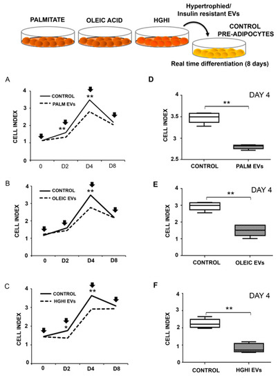EVs secreted by lipid hypertrophied and insulin resistant adipocytes stimulate neighbored cells atrophy. Real time differentiation of C3H10T1/2 preadipocytes incubated with pathological vesicles (A: Palmitate EVs; B: Oleic Acid EVs; and C: HGHI EVs) isolated from an equivalent amount of cells (vesicles isolated from the same amount of treated cells) is shown. Cell index graphs are shown from day 0 to 8 of differentiation (3 independent experiments with n = 4 replicates/experiment; vesicles were refreshed every 48 h: days 0, 2, 4, 6, and 8 of differentiation indicated with a black arrow). Box diagrams showing the cell index at day 4 of differentiation for those adipocytes treated with pathological EVs is shown (D–F). Comparisons between two groups were performed by Mann-Whitney U test; p ≤ 0.05 was considered statistically significant: * p < 0.05 and ** p < 0.01.