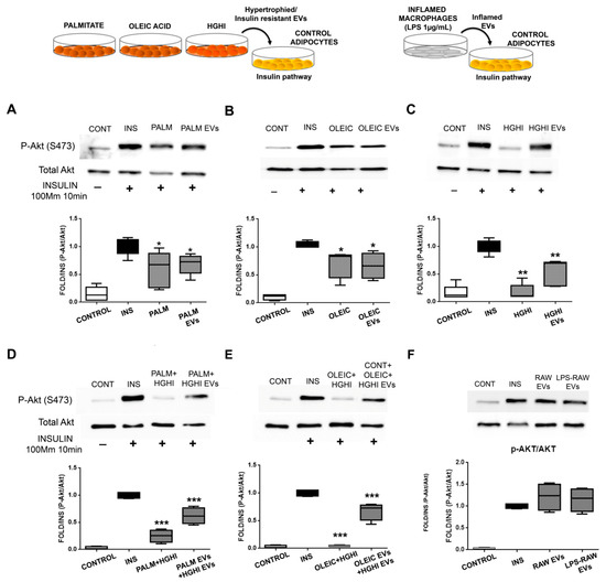 The treatment of healthy control differentiated adipocytes with vesicles isolated from pathological adipocytes inhibited the insulin pathway stimulation (10 min, 100 mM insulin) as assessed by Akt phosphorylation (Ser 473). Thus, we observed a significant decrease on Akt phosphorylation on healthy adipocytes incubated for 24h with pathological vesicles followed with insulin 100 nM stimulation during 10 min (Figure 5A–C). This effect was especially intense for HGHI vesicles paralleling the insulin resistance of the cells of origin (Figure 5C; Figure S1). Moreover, we observed that combined pathological cell models performing hypertrophy (palmitate/oleic) followed by insulin and glucose treatment (HGHI) exacerbated the deleterious effect; thus, vesicles from combined cell models were even more effective inducing insulin resistance (Figure 5D, E). However, EVs isolated from murine inflamed macrophages (LPS 1 µg/mL) did not affect insulin pathway through Akt (Figure 5F).
