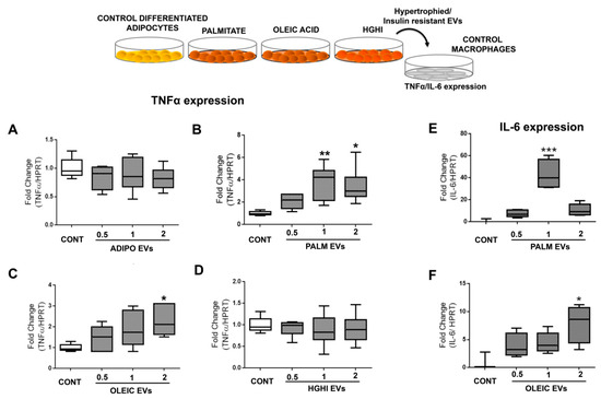 Functional assays exposing murine macrophages with lipid hypertrophied vesicles at different concentrations showed a significant increase of inflammation as measured by TNFα (Figure 6A–D) and IL-6 (Figure 6E,F). Interestingly, while a physiological dose of PALM EVs was enough to induce significant macrophage inflammation, it was necessary a double amount of OLEIC EVs to obtain a similar effect on macrophages. Inflammation was not observed when treating macrophages with vesicles from control healthy adipocytes, neither with those isolated from HGHI cells.