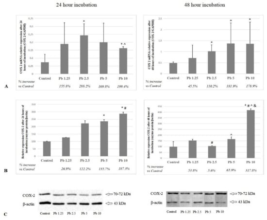 The effect of Pb on COX-2 mRNA and protein expression in macrophages after 24 and 48 h of incubation. (A) COX-2 mRNA expression following lead exposure; (B) COX-2 protein expression (densitometric analysis) of protein normalized to β-actin; (C) representative Western blot following lead exposure. Macrophages were cultured with lead solutions for 24 or 48 h. After incubation, cells were harvested by scraping and mRNA was measured by using the real-time PCR method (n = 6) and protein expression by using the Western blotting method (n = 3). * Statistically significant differences vs. control (p ≤ 0.05). # Statistically significant differences vs. 1.25 μg/dL (p ≤ 0.05). ^ Statistically significant differences vs. 2.5 μg/dL (p ≤ 0.05). & Statistically significant differences vs. 5 μg/dL (p ≤ 0.05). Control—cells incubated in RPMI medium with 10% FBS and without Pb.