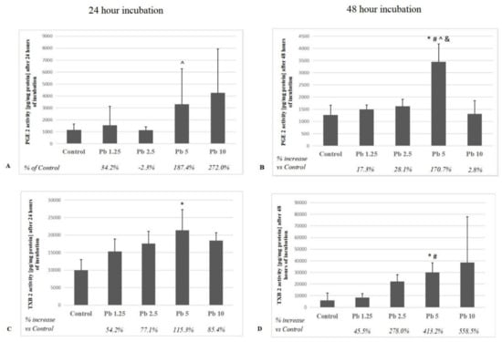 The effect of Pb on quantity of PGE2 and TXB2 in culture supernatants of macrophages cultured with various lead solutions for 24 h (A, C) or 48 h (B, D). Macrophages were cultured with lead solutions for 24 or 48 h. After incubation, cells were harvested by scraping and PGE2 or TXB2 and concentrations were measured by the ELISA method (n = 6). * Statistically significant differences vs. control (p ≤ 0.05). # Statistically significant differences vs. 1.25 μg/dL (p ≤ 0.05). ^ Statistically significant differences vs. 2.5 μg/dL (p ≤ 0.05). & Statistically significant differences vs. 10 μg/dL (p ≤ 0.05). Control—cells incubated in RPMI medium with 10% FBS and without Pb.