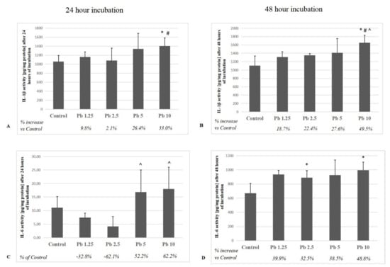 The effect of Pb on the quantity of IL-1β and IL-6 in culture supernatants of macrophages cultured with various Pb solutions for 24 h (A, C) or 48 h (B, D). Macrophages were cultured with lead solutions for 24 or 48 h. After incubation, cells were harvested by scraping and IL-1β or IL-6 concentration was measured by the ELISA method (n = 6). * Statistically significant differences vs. control (p ≤ 0.05). # Statistically significant differences vs. 1.25 μg/dL (p ≤ 0.05). ^ Statistically significant differences vs. 2.5 μg/dL (p ≤ 0.05). Control—cells incubated in RPMI medium with 10% FBS and without Pb.