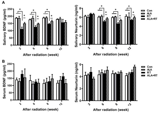ALA maintains neurotrophic factor levels in SGs. Sprague–Dawley rats were subjected to 18 Gy irradiation in the head and neck region. SGs and serum were collected at each time points after irradiation and subjected to ELISA to measure BDNF (left in A and B) and neurturin (right in A and B) levels. N = 12–16 SGs/group. Values are represented as the mean ± SEM. * p < 0.05.