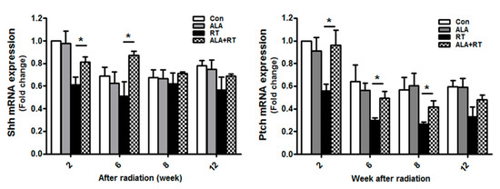 Hedgehog (Hh) signaling is known to be activated during the functional regeneration of adult SGs after duct ligation [15]. Moreover, transient activation of the Sonic Hedgehog (Shh) gene rescues radiation-induced hyposalivation [13]. We investigated the effect of ALA on radiation-induced Hh signaling. The mRNA expression levels of Shh and its receptor Patched (Ptch), Hh signaling and regeneration-related factors, were measured by qPCR. In the irradiation group, Shh and Ptch Mrna levels were decreased; however, in the irradiation group treated with ALA, the mRNA level of Shh was increased at 2 and 6 weeks and that of Ptch at 2, 6, and 8 weeks (Figure 5). This suggests that ALA is involved in SG regeneration after irradiation via Hh signaling.