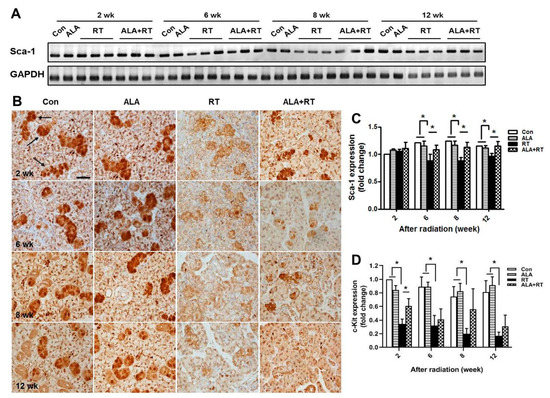 To examine the effect of ALA on the regenerative potential of SGs, we assessed the production of stem cells in irradiated glands treated with ALA. Rodent SG stem cell/progenitor cells express well-established stem cell markers, including Sca-1 [16]. However, the number of Sca-1-positive cells is extremely low in vivo. Thus, we performed reverse-transcription PCR to assess Sca-1 expression. Irradiation alone significantly reduced Sca-1 mRNA expression at 6, 8, and 12 weeks after irradiation, suggesting a deficit in resident SG stem/progenitor cells compared with non-irradiated controls. Rats that received ALA demonstrated significantly enhanced Sca-1 mRNA expression compared with the irradiated group (Figure 6A,C). To confirm effect of ALA on the preservation of stem cell population, we performed immunostaining for c-Kit. c-Kit is also known to SG stem/progenitor cell markers in mice and rodents [17]. c-Kit-positive signals were detected in the excretory ductal cells of the submandibular gland (arrow in Figure 6B). The localization of c-Kit-positive signals coincided well with the previous report [17]. Irradiation significantly downregulated c-Kit expression particularly in ductal structures in all time points (RT), whereas ALA treatment prior to irradiation restored c-Kit expression significantly in 2 weeks, but tended to ameliorate in other time points (ALA + RT) (Figure 6B,D). These data suggest that ALA can rescue resident stem cells in the irradiated SG environment.