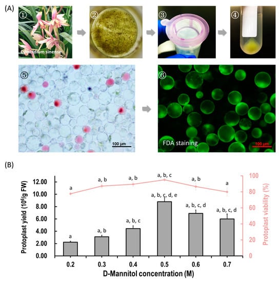 Protoplast isolation from flower petals of Cymbidium orchids. (A) Schematic illustration of protoplast isolation from Cymbidium orchids. (1) Cymbidium flower petals were collected and cut into 0.5–1.0 mm strips using fresh surgical blades on sterile filter papers; (2) immediately, transfer strips into in a 100 mL flask containing enzymatic solution; (3) after 5 h incubation at 28 °C in dark, the solution containing released protoplasts were filter through a 150 μm nylon mesh into a 50 mL round-bottomed tube; (4) following centrifuge at 200 rpm for 2 min, the protoplast pellet were re-suspended with W5 solution; (5) check the morphology and yield of protoplasts under a microscope and (6) measure the protoplast viability using the FDA staining method. (B) Optimization of Cymbidium protoplast isolation conditions. A series of D-mannitol concentration in the enzyme solutions (0.2, 0.3, 0.4, 0.5, 0.6 and 0.7 M) were tested for different tissues to ensure that released protoplasts do not rupture or collapse during enzyme digestion; data presented as means of three biological replicates with error bars indicating standard deviations (SD), and different letters (a–e) among treatments indicate statistically significant differences at p < 0.05 based on the Tukey–Kramer test.