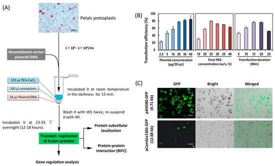 Protoplast-based transient expression system (PTES) has been proven to be a powerful experimental tool in molecular biology. It is widely used for protein localization, protein–protein interactions, identification of the gene function and gene regulation [14,34,44,46,47,48,49]. Transient protoplast transfection has been used due to its advantages in high screening efficiency with gene silencing and genome editing technologies, prior to the development of transgenic plants [43,50,51,52]. Protoplast transfection refers to the introduction of exogenous nucleic acids into protoplasts mediated by polyethylene glycol (PEG) or electroporation [53,54,55]. PEG-mediated transfection method is commonly used to introduce DNA or RNA into protoplasts. To obtain reliable and reproducible results, high transfection efficiency (>50%) is required [14]. In addition to viability and quantity of protoplasts, DNA or RNA amount, final concentration of PEG and incubation time are factors affecting transfection efficiency [41,56]. High level transfection efficiency (>80%) has been achieved using Phalaenopsis petal protoplasts [34]. This is equivalent to or better than that of previously reported transfection efficiencies [14,42]. However, the transfection efficiency dramatically decreases with an increase of plasmid DNA size from 5 to 10 kb [50,57,58,59]. Hence, improving transfection efficiency with a larger size plasmid is necessary for genome editing and other studies.