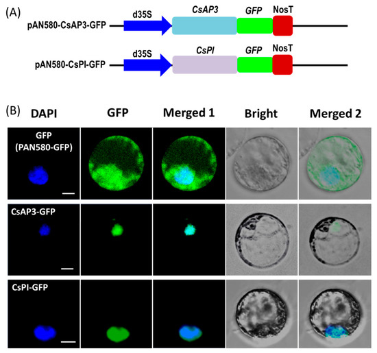 Cellular characters of proteins encoded by CsAP3 and CsPI were investigated using protein localization with this orchid PTES. Vectors used were obtained by cloning the coding sequences (CDSs) of CsAP3 (GenBank accession number: JQ326260.1) and CsPI (JQ326259.1) into the vector PAN580-GFP. Briefly, total RNA was extracted from freshly collected young leaves of Cymbidium sinense using an RNA Simple Total RNA Kit (Tiangen, Beijing, China). The DNA-free RNA was used for first-strand cDNA synthesis with oligo (dT) primers and a PrimeScript™ 1st strand cDNA Synthesis Kit (Takara, Dalian, China), following the manufacturer’s instructions. The specific primers with overlapping homologous ends were designed using Primer Premier 5.0 software (Premier, Palo Alto, CA, USA) according to the full-length CDSs of CsAP3 and CsPI, respectively (Table S1). Subsequently, the fragments for each gene were amplified using PrimerSTAR Max DNA Polymerase (Takara, Dalian, China) with the cDNA and the specific primers. The PCR products were purified and full-length CDSs without termination codon were cloned into certain vectors by recombination using the Seamless Assembly Cloning Kit (CloneSmarter, Houston, USA) following the manufacturer’s instructions. Recombined vectors were transformed into Escherichia coli DH5α competent cells (Tiangen, Beijing, China) according to the manufacturer’s instructions and confirmed by sequencing. Ultimately, CDSs of CsAP3 and CsPI were inserted between the dual cauliflower mosaic virus (CaMV) 35S promoter and GFP gene of pAN580-GFP for subcellular localization analysis, resulting in the recombination plasmids of pAN580-CsAP3-GFP and pAN580-CsPI-GFP expressing GFP fusion-proteins, respectively.
