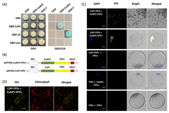 Protein–protein interaction studies using the PTES. (A) Yeast two-hybrid assay (Y2H) of proteins encoded by CsPI and CsAP3. (B) Vectors used for bimolecular fluorescence complementation (BiFC) assays were obtained by cloning the full-length CDSs of CsAP3 and CsPI into the vectors pSPYNE-35S and pSPYCE-35S, respectively. (C) Fusion proteins CsAP3-YFPn and CsPI-YFPc were co-expressed in Cymbidium protoplasts and yellow fluorescent protein (YFP) signals were detected in nuclei where the DAPI signal presented, while negative controls did not produce any BiFC fluorescence; (D) BiFC assays were also carried out in N. benthamiana leaves and strong YFP signals were observed in the protoplasts, especially in the nuclei. Bar = 10 μm.
