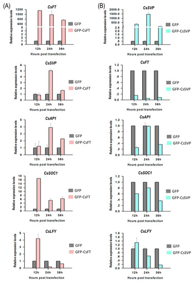The gene FT is the "flowering element" of plants that induces them to bloom through forming flowering complexes with a series of proteins with transcriptional activity [68,69,70]. However, SVP genes suppress the expression of flowering integration factors SOC1 (MF474250.1), FT and LFY (KC138806.1) [68,69,70]. Therefore, these two key flowering regulatory genes CsFT (accession number: HM803115.1) and CsSVP (MF462098.1) were chosen to investigate the regulations to their downstream genes in orchid protoplasts. Full–length CDSs of CsFT and CsSVP were cloned into vector pAN580, and replaced with GFP gene, resulting in plasmids pAN580-CsAP3 and pAN580-CsPI, respectively (Figure S2). Both plasmids transiently expressing proteins encoded by CsFT and CsSVP were transfected into Cymbidium protoplasts, respectively. The protoplasts were incubated at 23 °C in the dark and harvested at 12, 24 and 36 hpt. The relative expression levels of CsFT and CsSVP along with their downstream genes CsLFY, CsSOC1 and CsAP1 were determined by qRT-PCR.