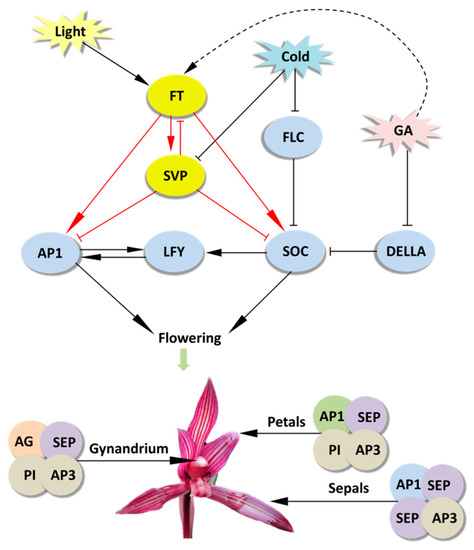 - Yang, F.X.; Zhu, G.F.; Wei, Y.L.; Gao, J.; Liang, G.; Peng, L.Y.; Lu, C.Q.; Jin, J.P. Low-temperature-induced changes in the transcriptome reveal a major role of CgSVP genes in regulating flowering of Cymbidium goeringii. BMC Genom. 2019, 20, 53. [Google Scholar] [CrossRef]