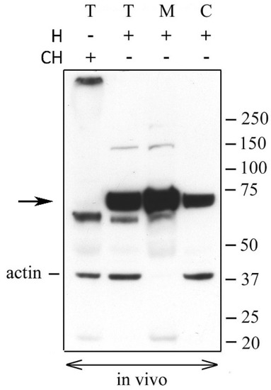 Versican fragments containing the neo-epitope DPEAAE are detected in OCCs expanded in vivo. The complexes expanded in vivo were isolated from naturally cycling gilts (two porcine OCCs for each lane). Total (T), matrix (M) and cell (C) extracts from expanded OCCs digested with Streptomyces hyaluronidase (H) or chondroitinase ABC (CH) were analyzed by western blot with anti-DPEAAE versican antibody. Actin immunodetection was performed to compare sample loading. A representative blot of four independent experiments is shown.