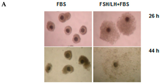 Porcine ovaries were collected at a local abattoir and immediately transported to the laboratory. Oocyte-cumulus complexes (OCCs) were aspirated from medium-sized antral follicles about 3–5 mm in diameter. The culture medium was M199 (Gibco, Invitrogen) supplemented with 20 mM NaHCO3, 6.25 mM HEPES, 0.91 mM sodium pyruvate, 1.62 mM calcium lactate, and antibiotics (all from Sigma, Prague, Czech Republic) as well as with recombinant human follicle-stimulating hormone (FSH; 100 ng/mL; Gonal, Merck Serono, Modugno, Italy), recombinant human luteinizing hormone (LH; 100 ng/mL; Luveris, Merck Serono, Modugno, Italy), and 5% fetal bovine serum (FBS; Sigma-Aldrich, Schnelldorf, Germany) or PVP (polyvinylpyrolidone; 3 mg/mL; Sigma, Prague, Czech Republic). Groups of 30 OCCs were cultured in 300 µL of medium in 4-well dishes (Nunclon, Roskilde, Denmark) at 38.5 °C in an atmosphere of 5% CO2 in air for 26 or 44 h.