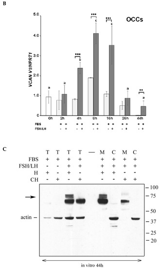 The process of cumulus expansion during oocyte maturation is induced in vitro by gonadotropin stimulation. To verify whether porcine OCCs upregulate versican V1 during in vitro cumulus expansion, as it occurs in vivo, we cultured OCCs in FBS-supplemented medium in the absence or in the presence of FSH/LH. The results reported in Figure 2 showed that the cumulus expansion induced by FSH/LH (Figure 2A) was accompanied by an increase in VCAN V1 mRNA levels in OCCs analyzed by real-time (RT)-PCR (Figure 2B). A significant increase in the expression was detected at 4 h, peaked at 8-16 h, and returned toward the basal level at 26 h. Then, we investigated whether versican V1 was cleaved in vitro, like in vivo, during the process of cumulus expansion. Groups of porcine OCCs were cultured as above for 44 h (i.e., the time required for in vivo and in vitro full OCC expansion), as shown in Figure 2A. Complexes not stimulated (unexpanded) or stimulated with FSH/LH (expanded) were digested with Hyal or ChABC and analyzed by western blot (Figure 2C). No versican-derived fragments were detected in protein extracts of unstimulated OCCs. In agreement with the results obtained from in vivo expanded OCCs, the complexes stimulated to expand in vitro showed the ~70 kDa versican fragment in the cumulus ECM only after the digestion with Hyal. Moreover, as observed in vivo, the ~65 kDa band of versican fragment was present in these samples and did not require Hyal digestion to enter the gel, since it was present also after ChABC digestion. However, in this in vitro condition, the ~65 and ~70 kDa bands showed similar intensities. We conclude that OCCs induced to expand in vitro with gonadotropins (FSH/LH) in serum-supplemented medium increase the versican V1 expression and accumulate its N-terminal cleaved forms in the HA-rich cumulus ECM, closely resembling the in vivo condition.