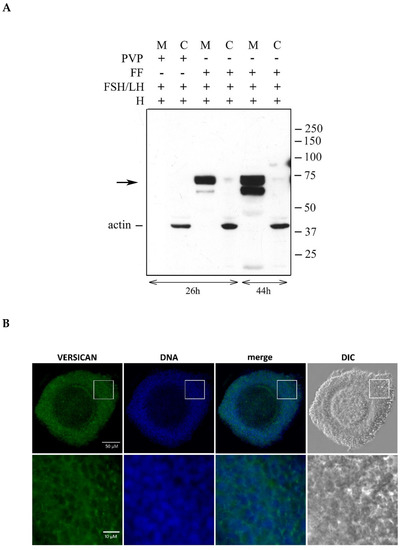 The follicular fluid (FF) constitutes the physiological environment in which cumulus expansion occurs. Therefore, with the aim to investigate the time course of versican cleavage in the cumulus ECM, groups of 15 porcine OCCs were stimulated for 26 or 44 h with FSH/LH in the presence of FF (Figure 3A). Then, they were digested with Hyal, and matrix and cell extracts were analyzed by western blot. The results clearly indicated that the versican cleaved product of ~70 kDa was already present in the ECM of OCCs cultured for 26 h, and its amount remained apparently unchanged at 44 h. Conversely, the ~65 kDa species accumulated in the cumulus ECM over time, being barely visible at 26 h but quite evident at 44 h. It is known that OCCs stimulated with gonadotropins in the absence of serum or FF did not organize HA-rich cumulus ECM [5]. Importantly, in these culture conditions, no versican fragments were associated with OCCs (Figure 3A, lanes 1 and 2).